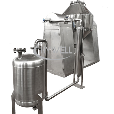 如果被干燥的物料中含有大量的溶剂或相对昂贵的溶剂。此旋转锥真空干燥机可以配备冷凝回收装置。双锥回转真空干燥机的冷凝器用于将溶剂通过冷凝器冷却成液体并回收以减少损失。或者被干燥的物料含有大量有毒溶剂。为了避免有毒溶剂对环境的影响,旋转锥真空干燥机还可以配备冷凝回收装置,回收有毒体积,减少环境污染。
